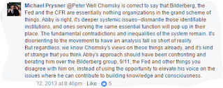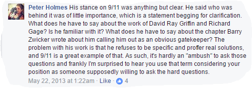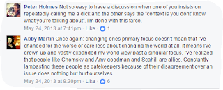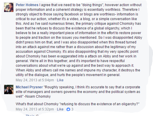 I will close this article by posting screen caps of the aforementioned Facebook post in which Mike Prysner uses two different accounts to verbally assault Peter Holmes for questioning Abby Martin about not getting Noam Chomsky's thoughts about what happened on September 11th. Keep in mind that this is Abby's producer and significant other.