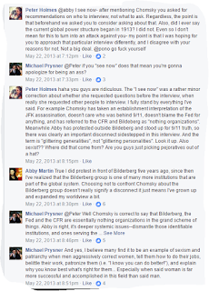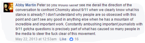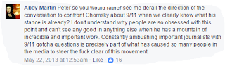 Abby closes the conversation by praising Chomsky and Amy Goodman and Jeremy Scahill as allies. To quote Chomsky, "What difference does it make?" if they keep their massive support bases in the dark about the most consequential event of our generation????? This conversation took place over four years ago, and I can only imagine just how much Abby's views have "evolved" since then. Hard to tell, because she won't even address any of this now.